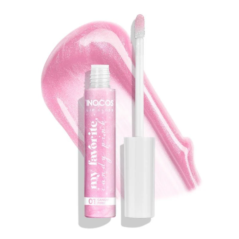Lip Gloss INOCOS Pink Candy com ácido hialurónico e efeito preenchimento.